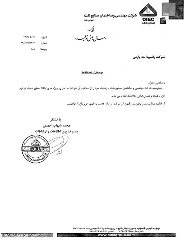 گواهی حسن انجام کار از شرکت مهندسی و ساحتمان صنایع نفت