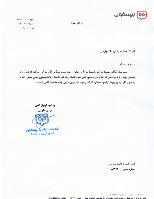 گواهی حسن انجام کار از شرکت خدمات ارتباط بیسفون