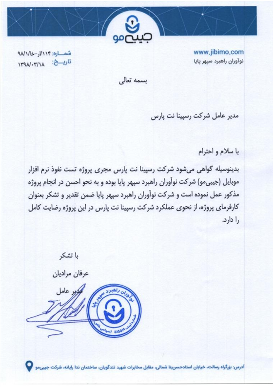 گواهی حسن انجام کار از شرکت نوآوران راهبرد سپهر پایا (جیبی مو)